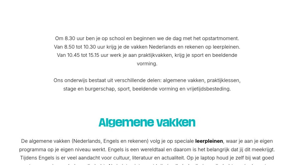 Ons onderwijs bestaat uit verschillende delen: algemene vakken, praktijklessen, stage en burgerschap, sport, beeldende vorming en vrijetijdsbesteding.